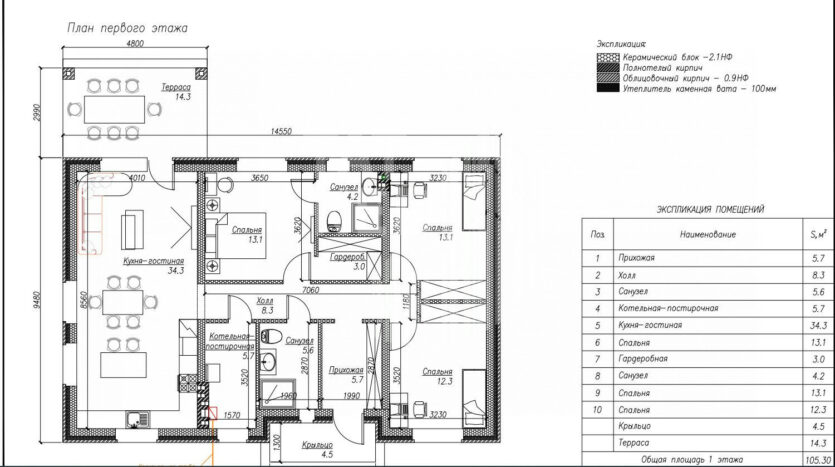 В доме расположены: крыльцо, входная группа, холл,санузел, котельная-гостирочная, кухня-гостиная, 3 спальни, гардеробная, терраса. Общая площадь дома 105,3 квм. С учетом террасы 124,10 кв м.