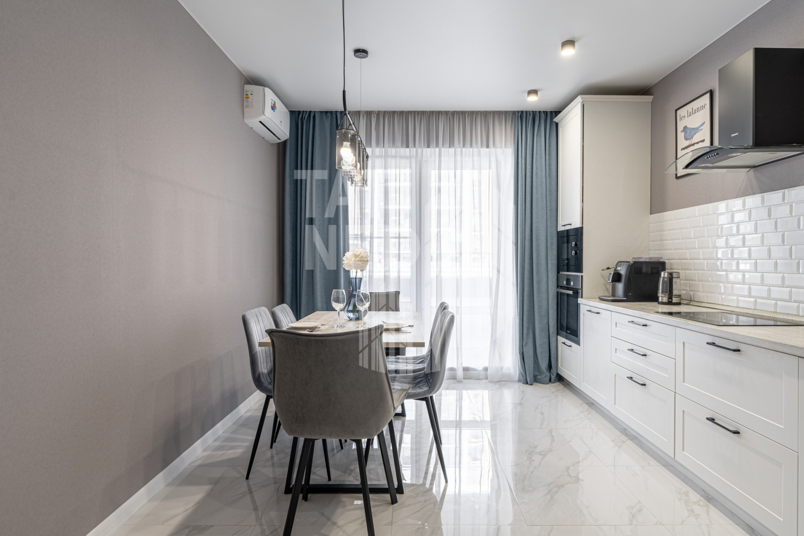стиральная машина, посудомоечная машина, варочная панель, духовой шкаф, вытяжка, два кондиционера, два телевизора