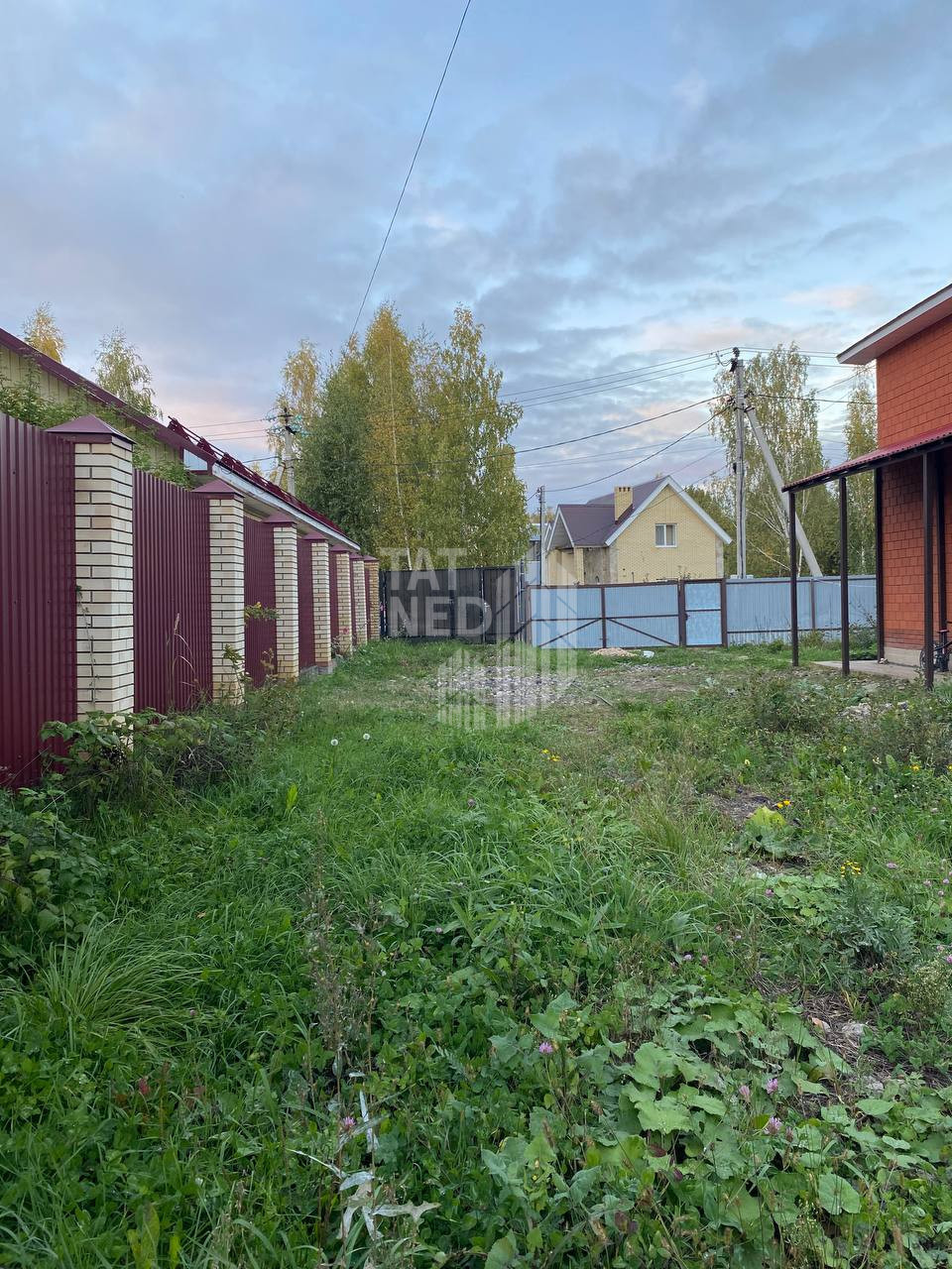Участок общей площадью 5,4 сотки имеет удобную Г-образную форму с длинным, независимым заездом через кованые черные ворота, что исключает проезд через чужую территорию. На участке без труда размещаются три автомобиля, что является большим плюсом для семей, часто принимающих гостей. Грузовые автомобили также имеют удобный подъезд. Четыре сотки участка отведены под плодоносящий сад-огород с малиной, кустарниками, вишней, сливой, яблонями и даже лесной земляникой. Электричество подведено по земле, с возможностью прокладки по верху после установки забора. Установлен септик, который требует минимального обслуживания (откачивался всего 3 раза за весь период). Также имеется хозблок для хранения.