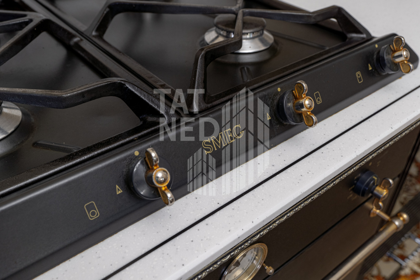 Кухонная зона с дорогостоящей техникой SMEG (холодильник, варочная панель, духовой шкаф, посудомоечная машина) и идеально вписанные в общую стилистику добротные качественные кухонные фасады станут мечтой любой хозяйки.