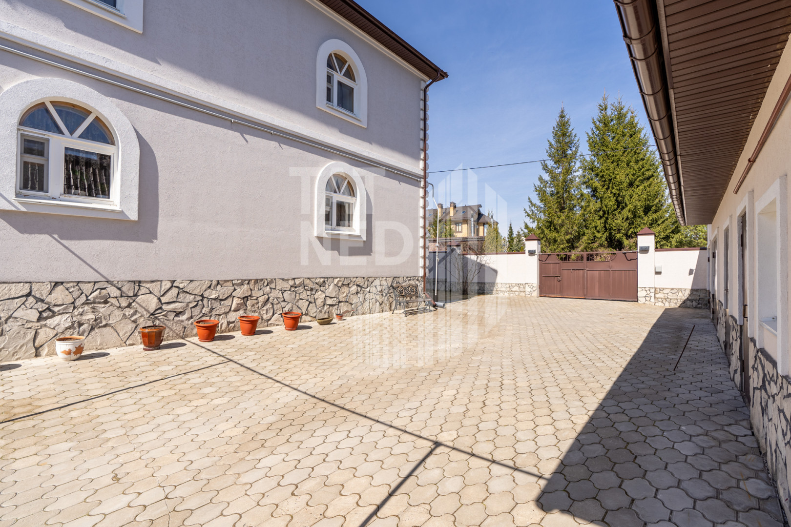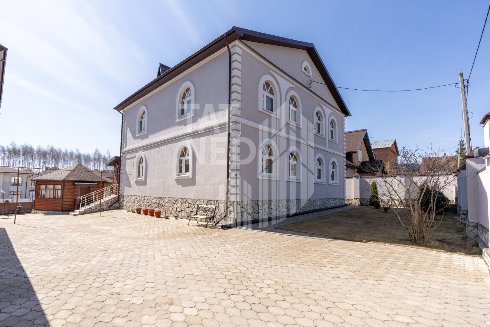 Фасадный забор в стиле дома, ворота открываются с пульта, калитка – домофон, брусчатка во дворе.