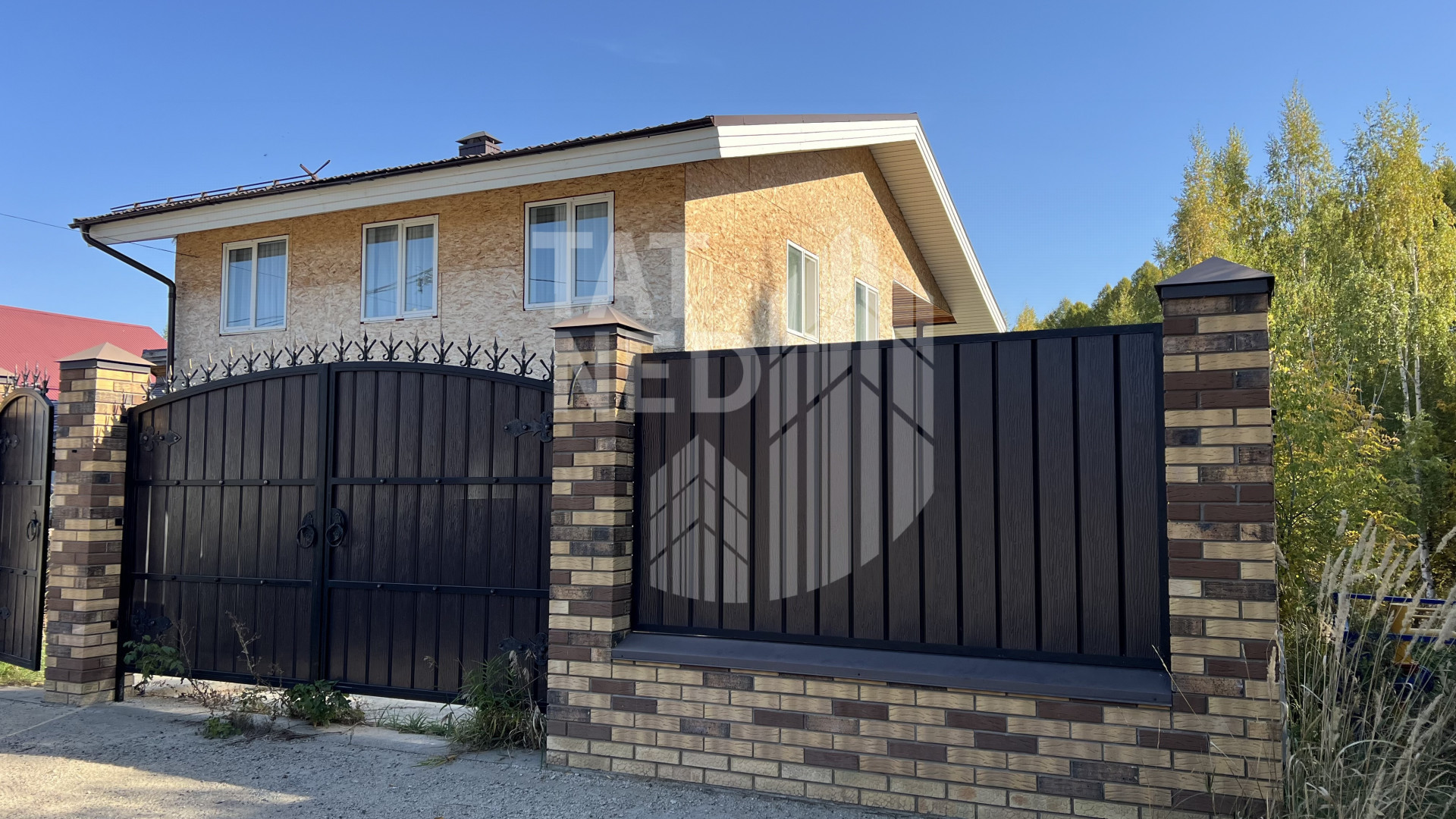 Фасадный забор из кирпича, дорожки, отмостка и площадка от ворот и до гаража залита бетоном, Гараж отапливаемый, со входом в дом, автоматические ворота.